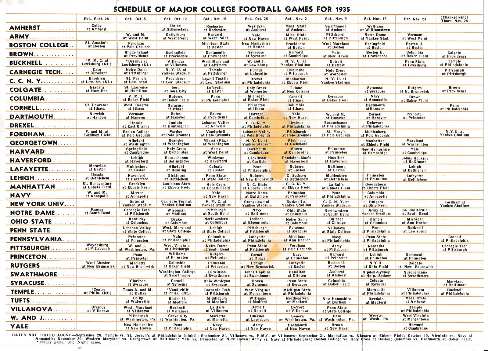 1935 College Football Pocket Foldout Schedule Schraffts 151568