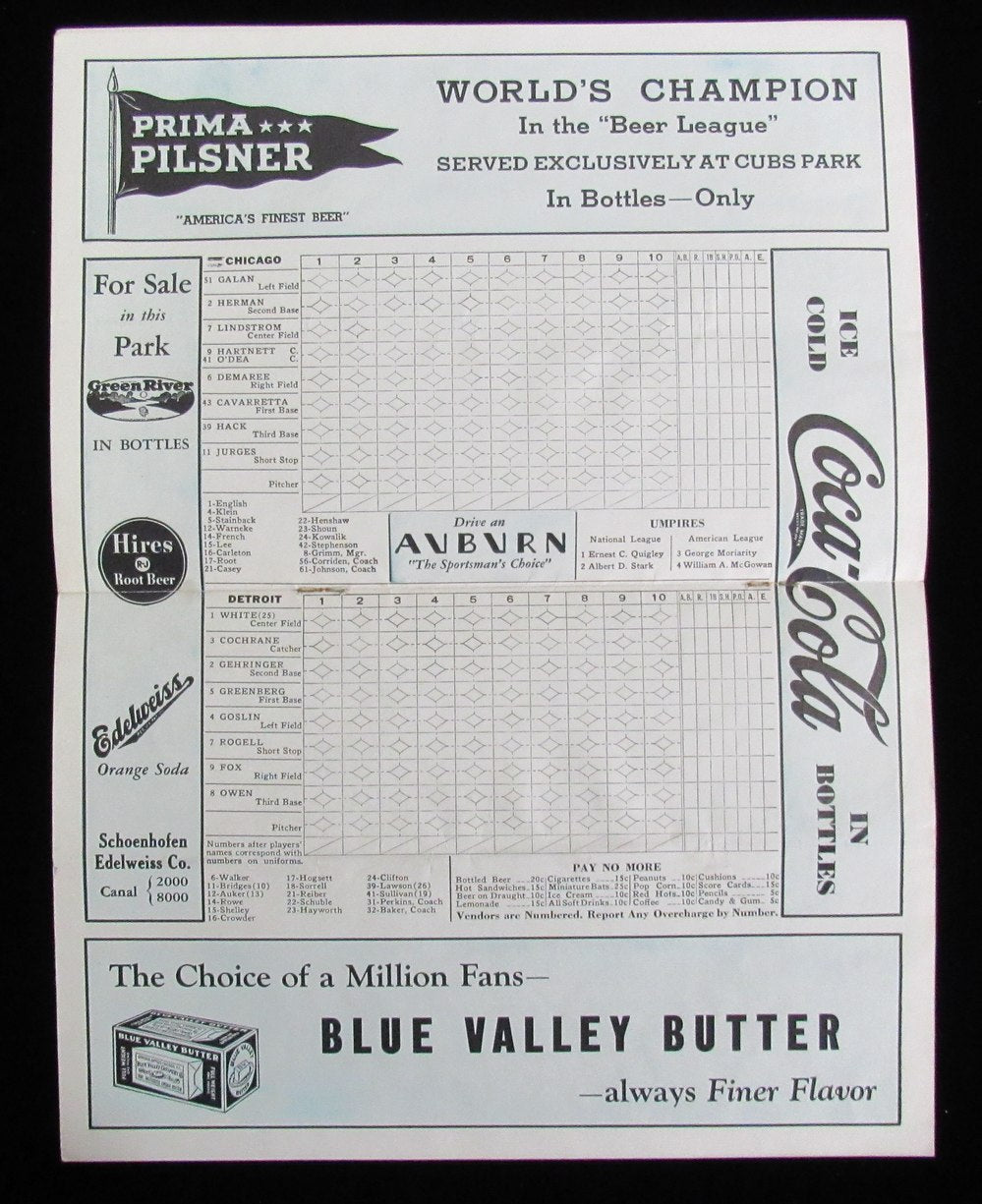 1935 World Series Scorecard Chicago Cubs vs. Detroit Tigers Wrigley Field 193294