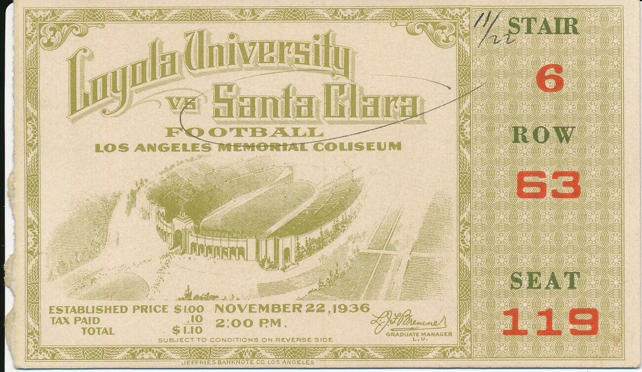 1936 Loyola University vs. Santa Clara Football Game Ticket Stub 148475