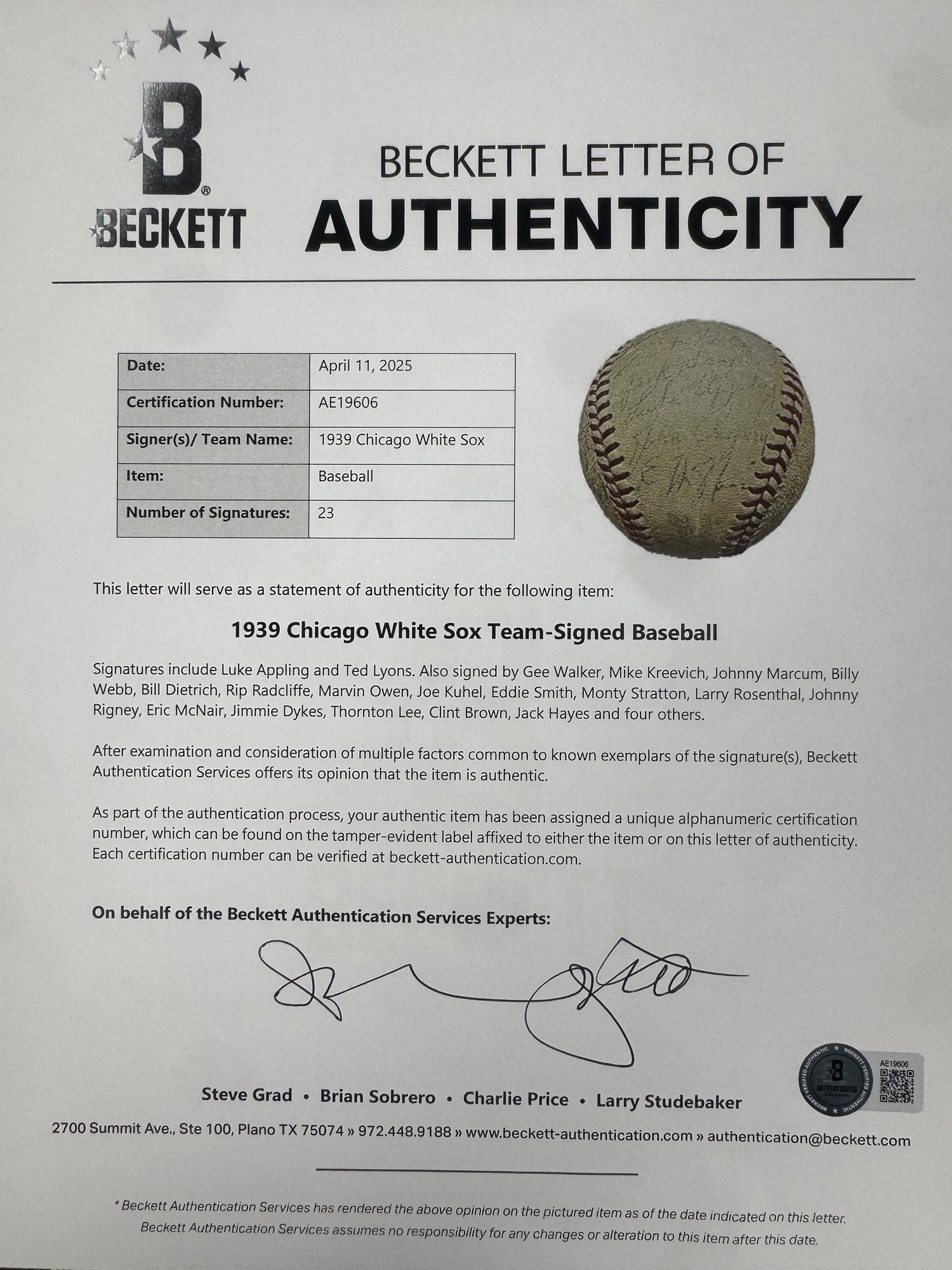 Offered is a 1939 Chicago White Sox Team Signed Baseball (23 Signatures). Signatures include: Luke Appling, Ted Lyons. Also signed by Gee Walker, Mike Kreevich, Johnny Marcum, Billy Webb, Bill Dietrich, Rip Radcliffe, Marvin Owen, Joe Kuhel, Eddie Smith, Monty Stratton, Larry Rosenthal, Johnny Rigney, Eric McNair, Jimmie Dykes, Thornton Lee, Clint Brown and Jack Hayes. This ball is authenticated by BAS/Beckett and includes their tamper-proof hologram sticker and Letter of Authentication.