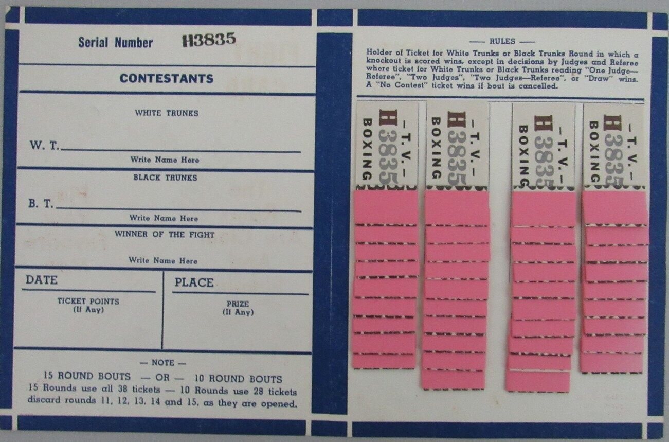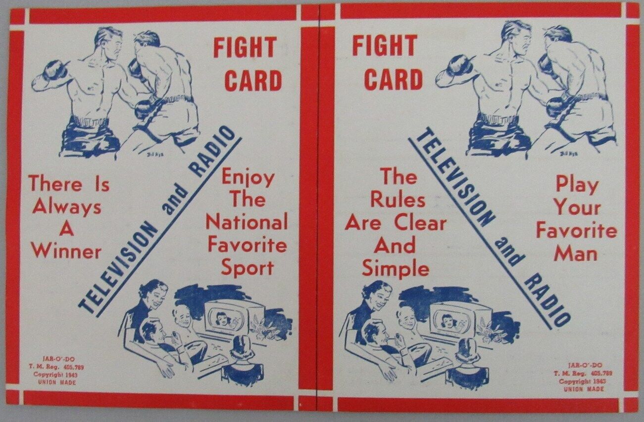 Offered is a 1943 Television and Radio Fight Card Betting Tickets. ?This booklet contains several tickets that people (friends, work groups, neighborhoods) could use to place bets on boxing events and watch on television or listen on the radio and then win money and prizes. In excellent condition. Bookies could keep track of them because they were coded and colored. Great graphics for framing. Full of Boxing Tickets. White Trunks and Black Trunks. Marked Union Made by Jar-O' Do