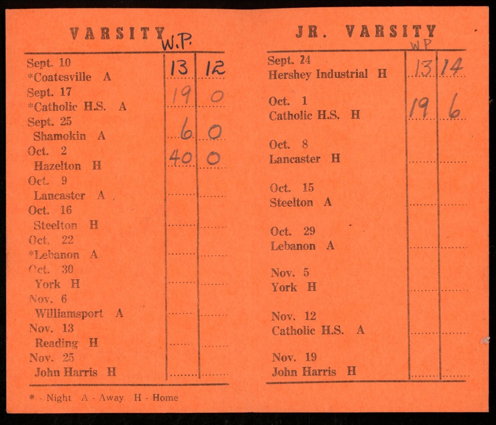 Offered is a 1948 William Penn High School Football 2.5x4.25 Pocket Schedule Harrisburg, PA. There are handwritten scores on the schedule.