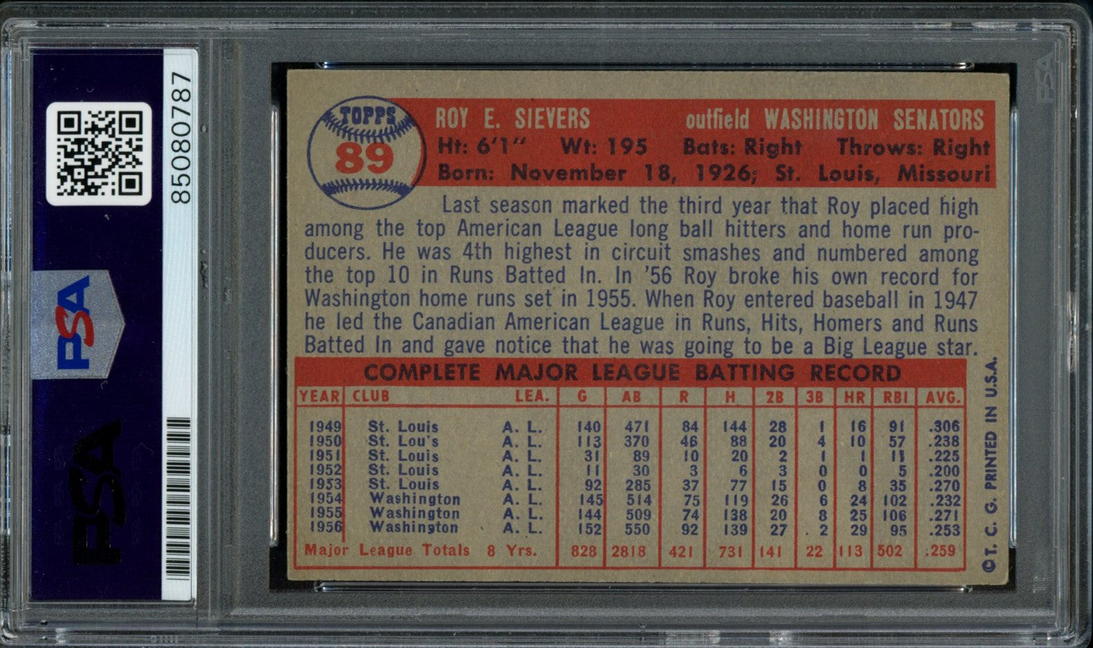 1957 TOPPS Roy Sievers #89 Auth Card Signed Senators PSA/DNA 184118