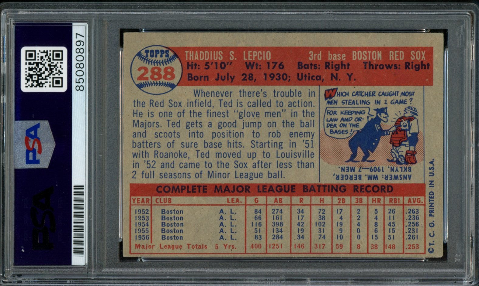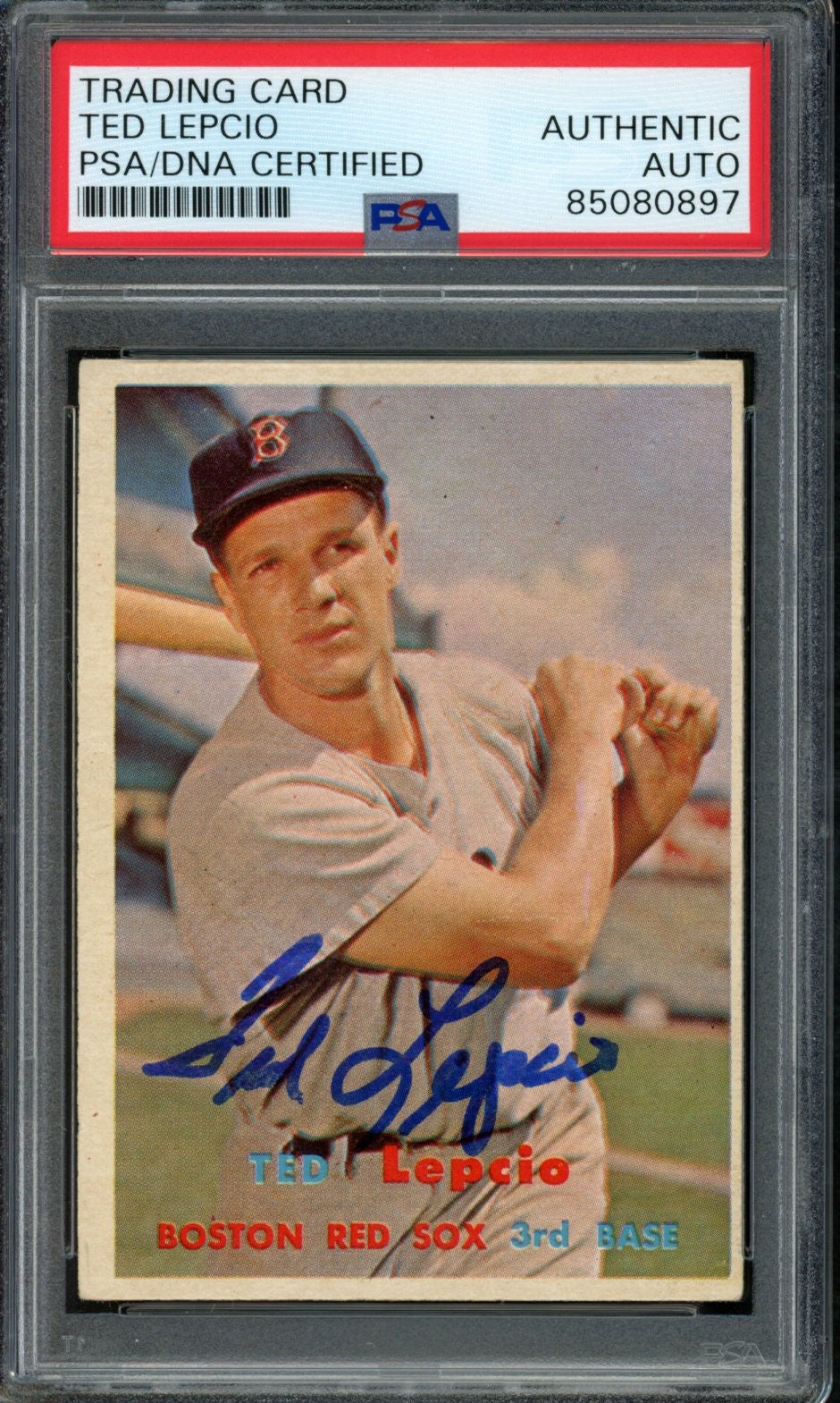 Offered is a 1957 TOPPS Ted Lepcio #288 Auth Card Signed Boston Red Sox. This card comes encapsulated in a tamper-proof holder and autograph has been authenticated by PSA/DNA. The card in the picture is the actual original card that you will receive.