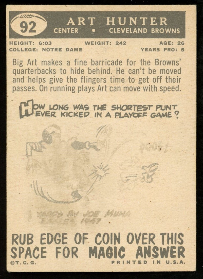 Offered is a 1959 TOPPS Football Card #92 Signed/Auto Art Hunter Cleveland Browns.