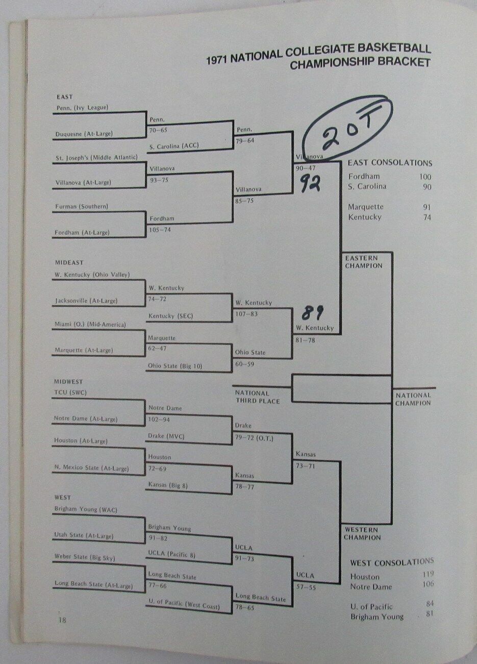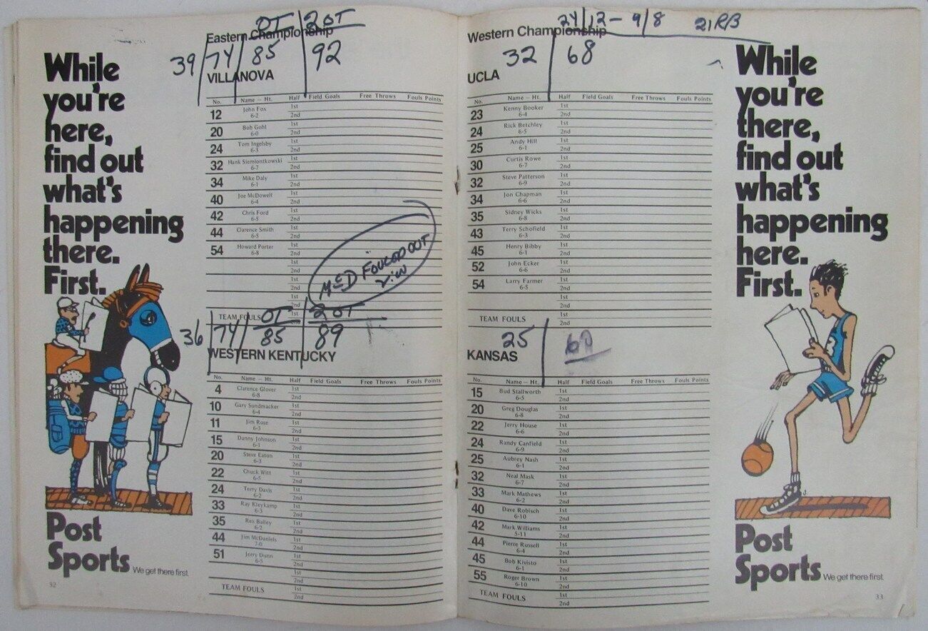 Offered is a March 25, 1971 NCAA Men's Basketball Championship Final Four Program Houston, Texas - Villanova, Western Kentucky, UCLA, and Kansas. The UCLA Bruins were National Champions. There is handwriting on the score card page and bracket page. Program is in great condition, fully intact, tight spine.
