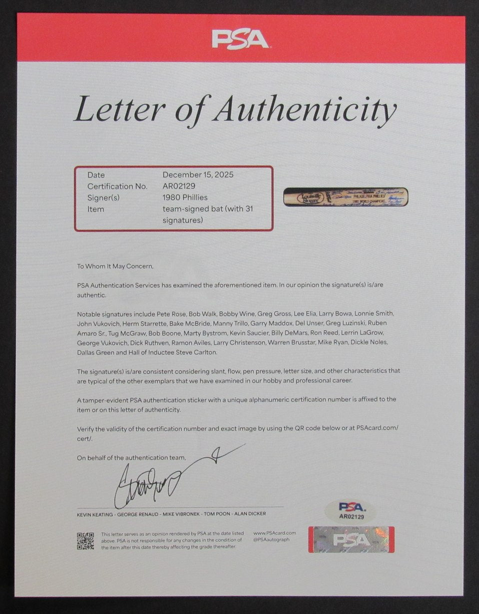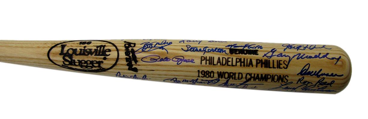 Offered is a 1980 World Series Champs Philadelphia Phillies Baseball Bat Signed by 31. Notable signatures include: Pete Rose, Manny Trillo, Larry Bowa, Bob Boone, Tug McGraw, Dickie Noles, Dick Ruthven, Warren Brusstar, George Vukovich, Dallas Green, Larry Christensen, Ron Reed, Lee Elia, Billy Demars, Greg Luzinski, Ruben Amaro Sr., Greg Gross, Marty Bystrom, Mike Ryan, Ozzie Virgil, Bob Walk, Kevin Saucier, Keith Moreland, Garry Maddox, Lonnie Smith, Herm Starrette, Bake McBride, Bobby Wine, Ramon Aviles, Randy Lerch, and Steve Carlton. This bat is authenticated by PSA/DNA and includes their tamper-proof hologram sticker and Letter of Authentication.