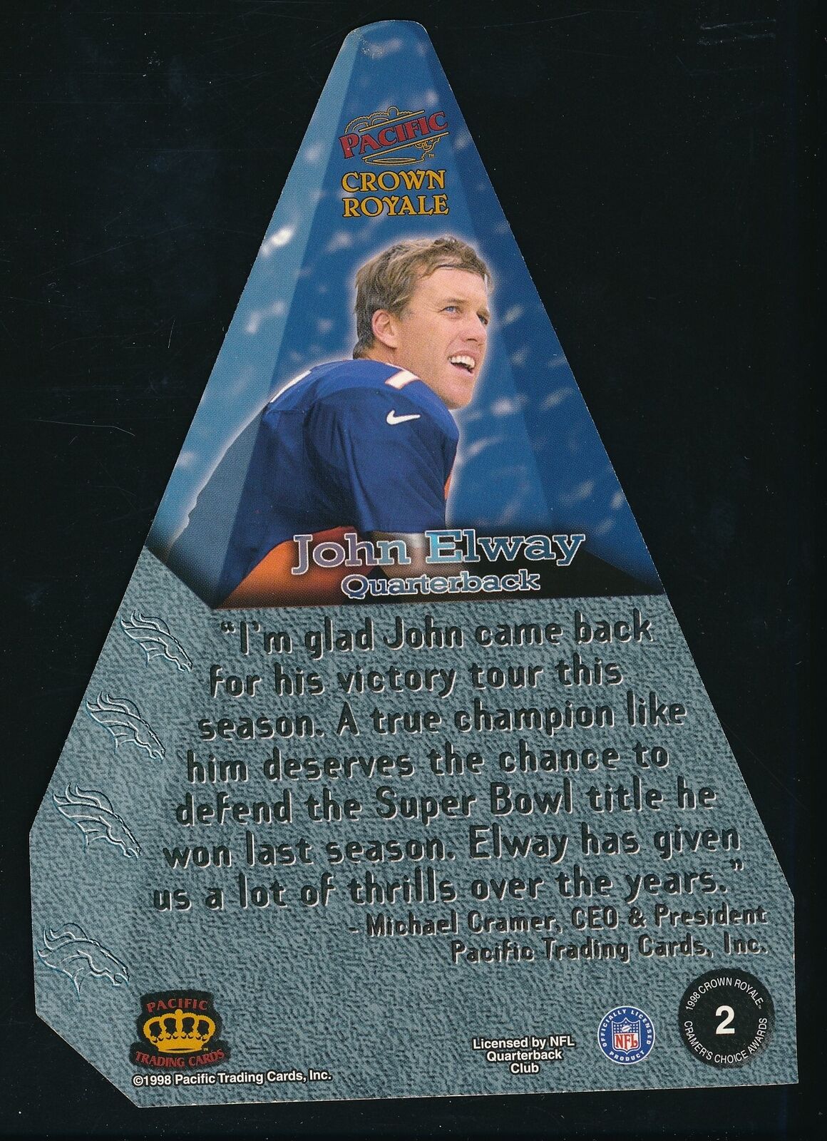 Offered is a 1998 Crown Royale John Elway HOF Cramers Choice Award Jumbo #2 Denver Broncos. No creases, Clean. You will receive the exact original card pictured.