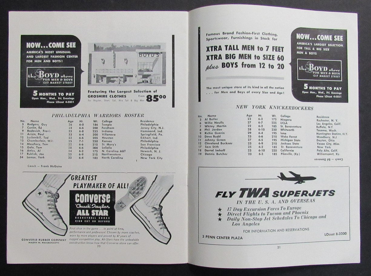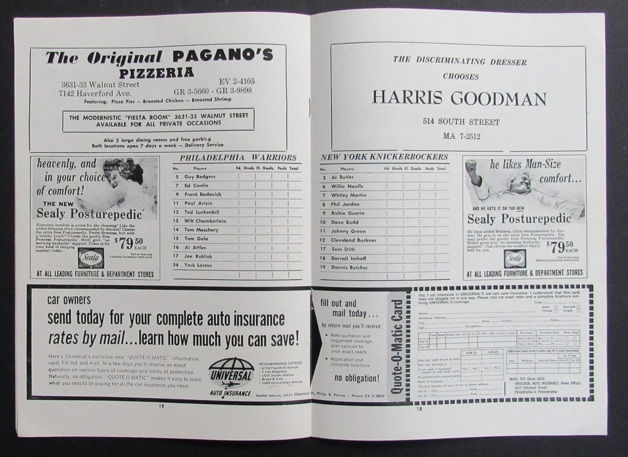 2/25/62 NBA Basketball Program Philadelphia Warriors vs. New York Knicks 198304