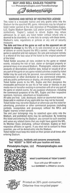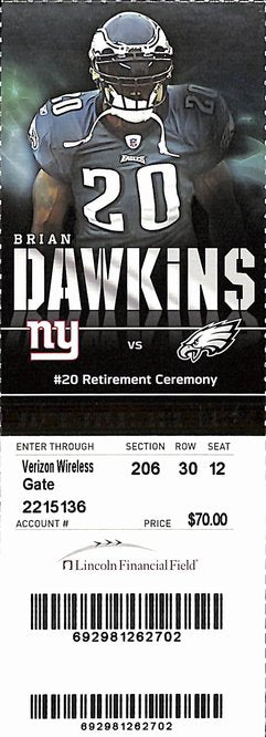 Offered is a 2012 Brian Dawkins HOF Retirement Ceremony Eagles vs. Giants Full Ticket.