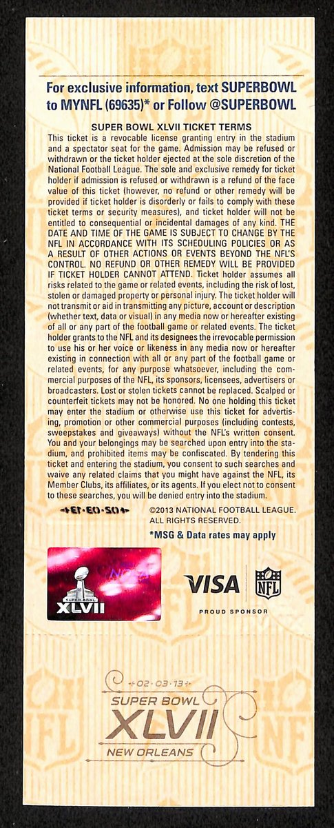 Offered is a 2013 Super Bowl XLVII Full Unused Mint Authentic Ticket Baltimore Ravens vs. San Francisco 49ers.