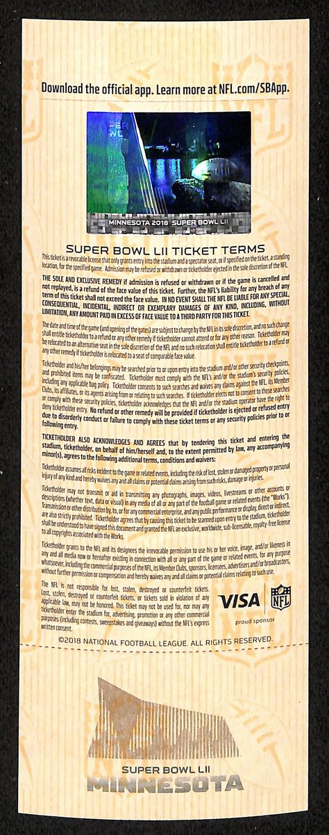 Offered is a 2018 Super Bowl LII Full Unused Mint Authentic Ticket Philadelphia Eagles vs. New England Patriots.