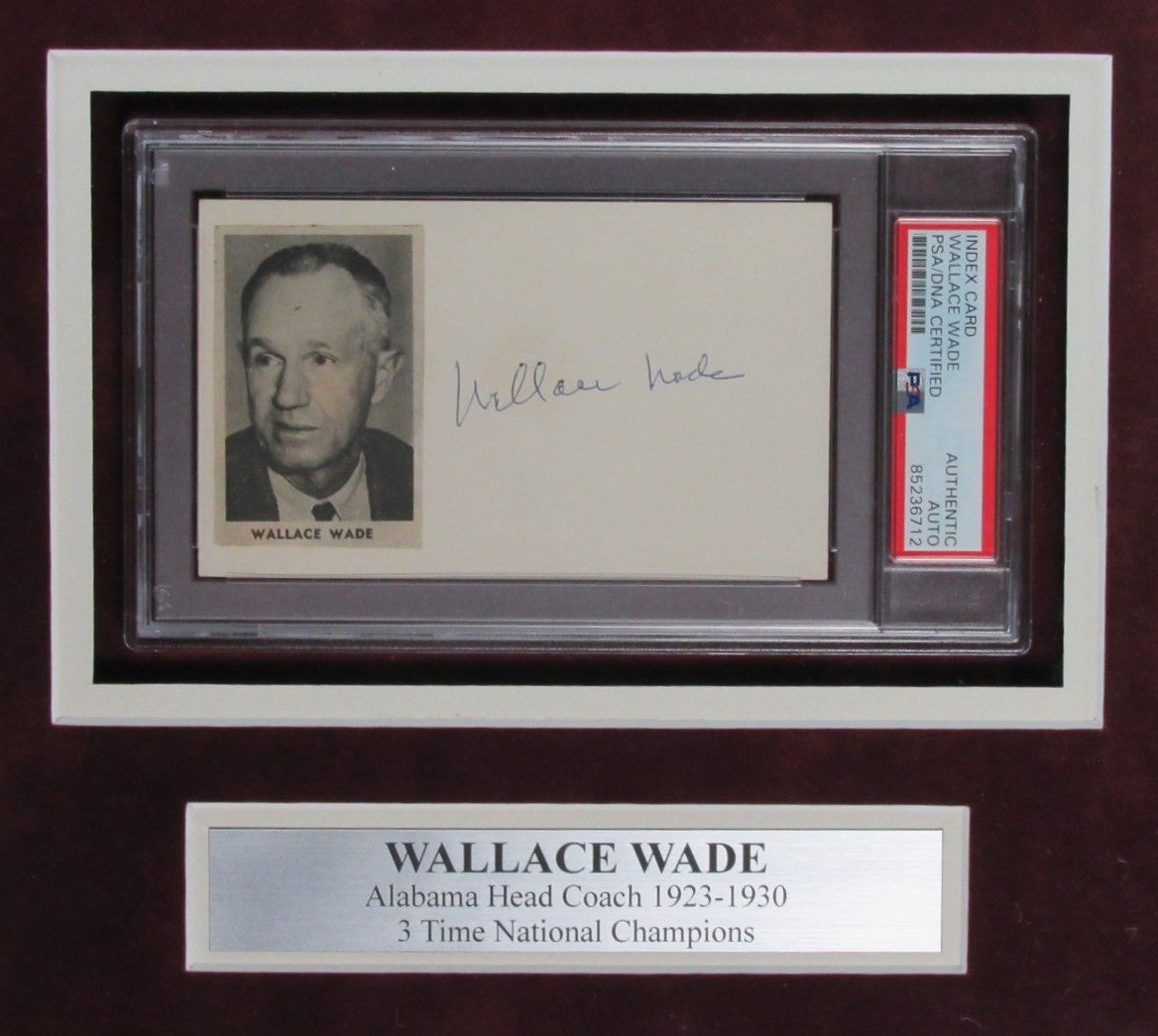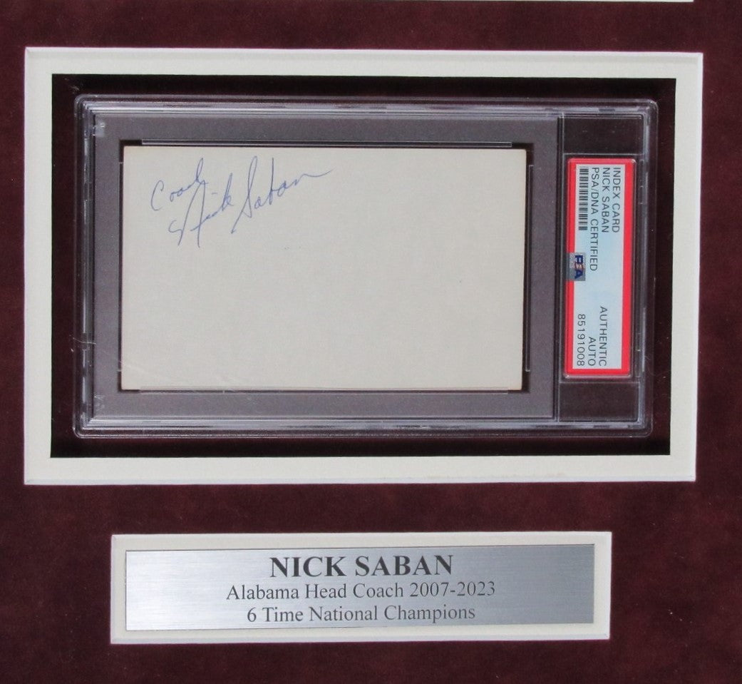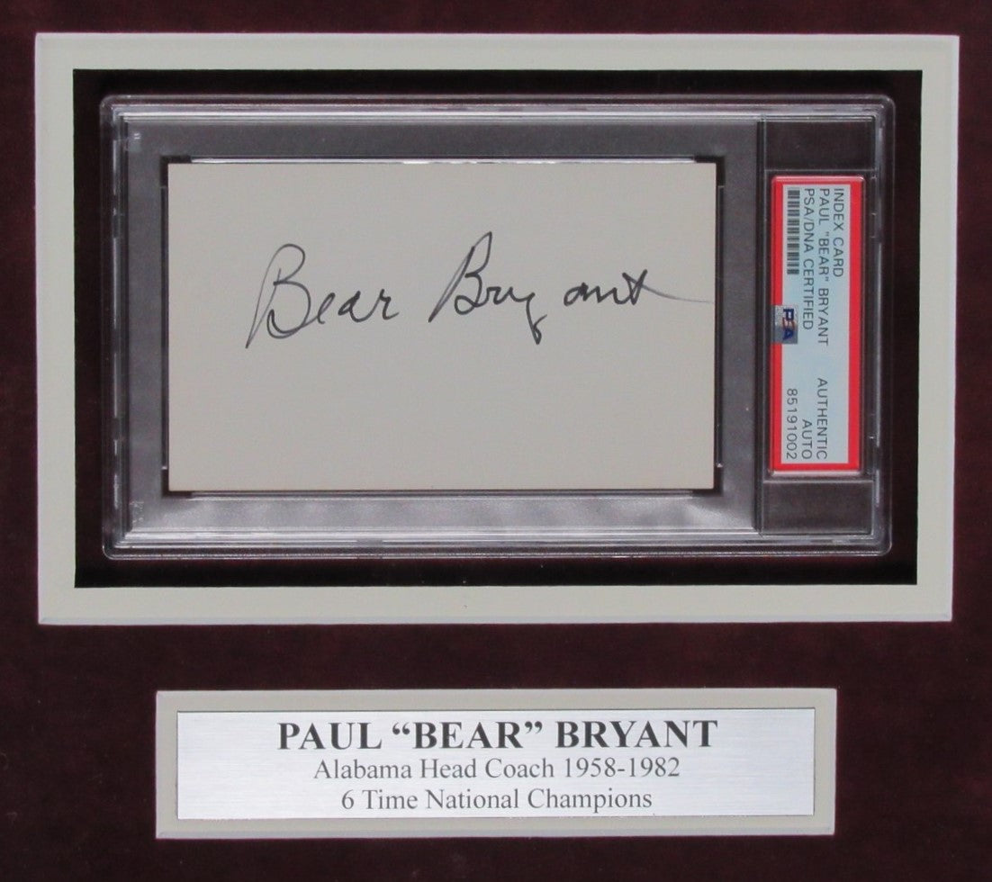 Offered is a Legendary Alabama Football Coaches Signed Index Cards w/8x10 Photos in a Framed Collage. The coaches are Wallace Wade, Bear Bryant, and Nick Saban. The outer frame size is 35 inches x 26 inches. These cards are authenticated by PSA/DNA and includes their Tamper-proof Hologram Sticker.