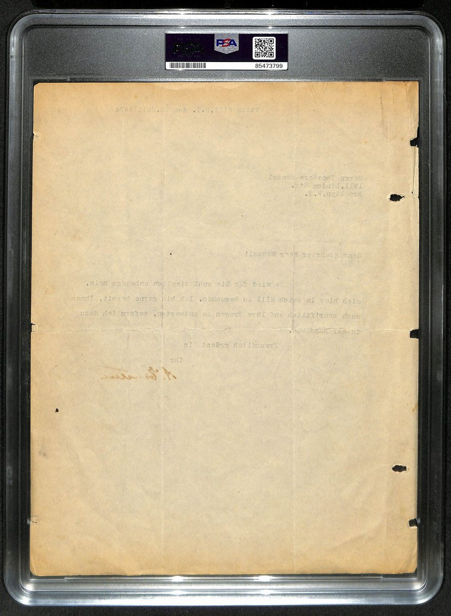 The letter is in very good to fine condition, showing light soiling, minor edge wear, and two file holes on the left margin. It has been encapsulated and graded GEM MT 10 by PSA/DNA, ensuring top-tier preservation and authenticity.