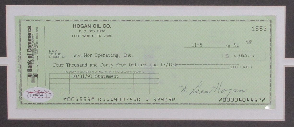 Offered is a Ben Hogan 1950 U.S. Open Signed/Auto 16x20 Photo Collage with Bank Check Framed. The outer frame size is 23 inches x 27 inches. This check is authenticated by JSA and includes their Tamper-proof Sticker and Certificate of Authenticity.
