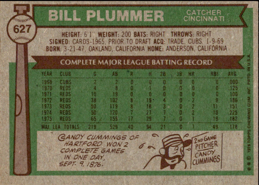 Offered is a Bill Plummer Autographed 1976 TOPPS Card #627 Cincinnati Reds.
