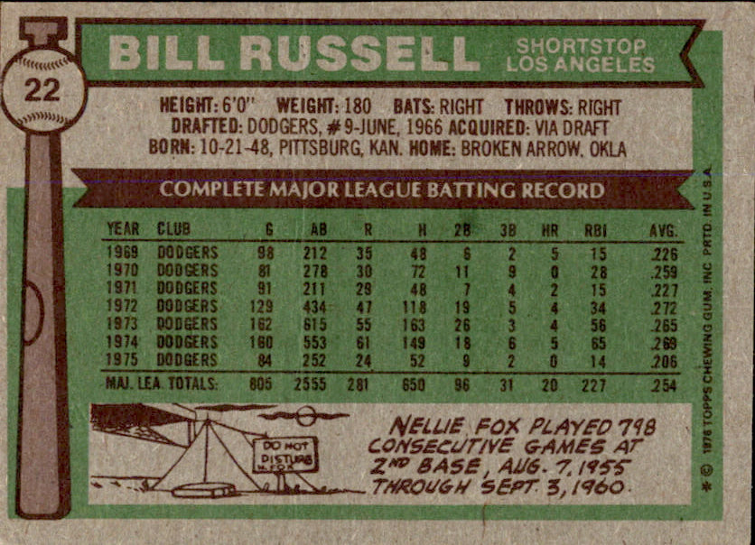 Offered is a Bill Russell Autographed 1976 TOPPS Card #22 Los Angeles Dodgers.