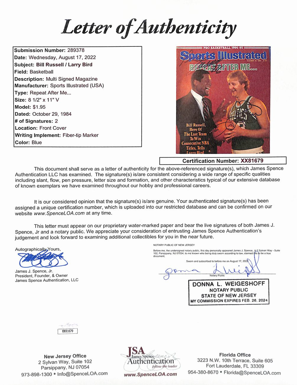 Offered is a Bill Russell/Larry Bird Dual-Signed/Autographed 10/29/1984 Sports Illustrated Magazine. This magazine is authenticated by JSA and includes their tamper-proof hologram sticker and Letter of Authenticity.