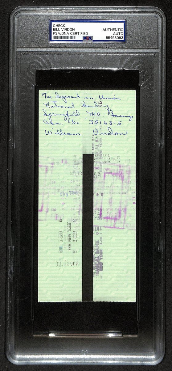 Offered is a Bill Virdon Signed/Autographed 1975 New York Yankees Payroll Bank Check with Yankees Logo and Letter Head. This check is authenticated by PSA/DNA and is encapsulated in their tamper-proof acrylic case.