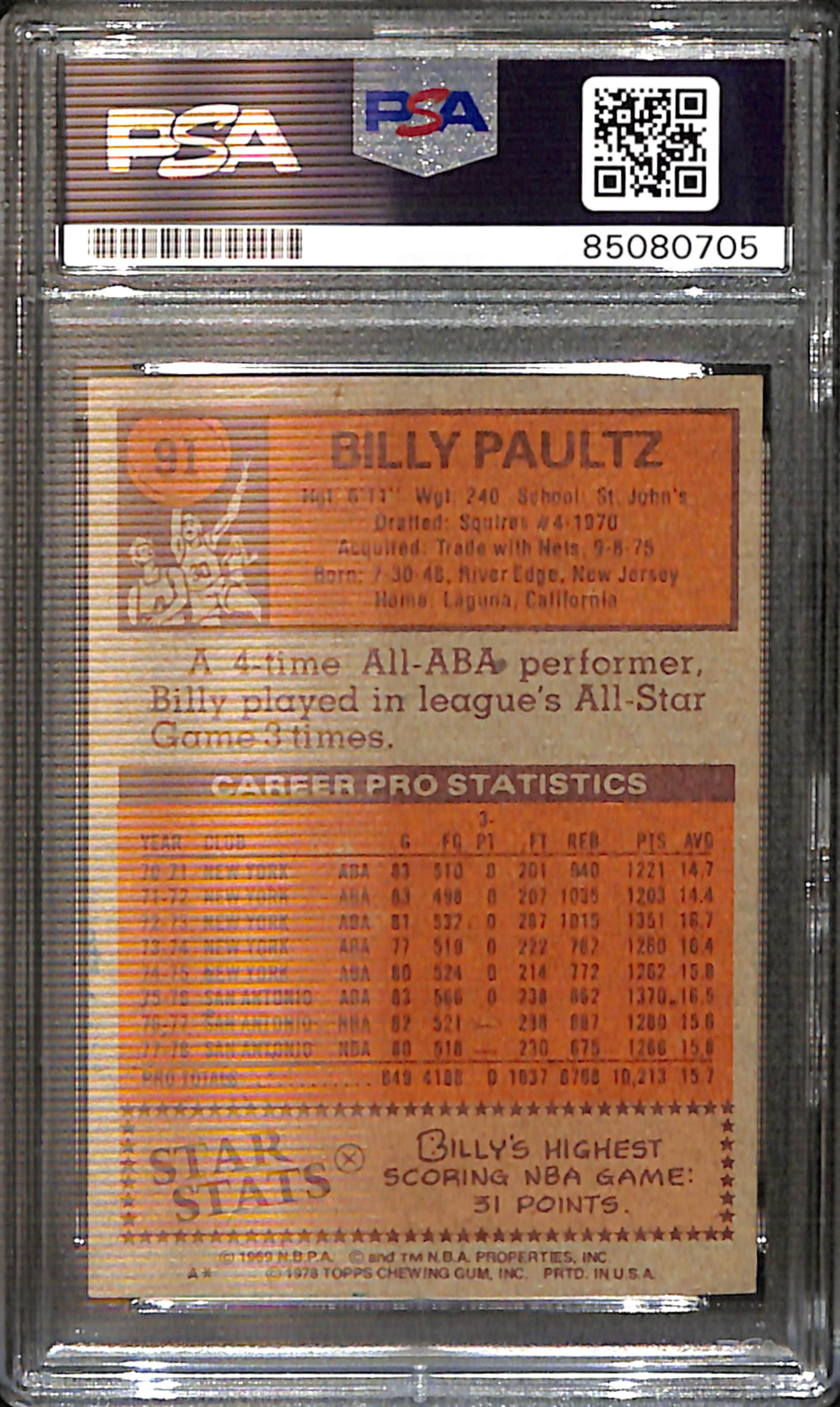 Offered is a Billy Paultz Signed/Auto 1978 Topps Card #91 San Antonio Spurs. This Card is authenticated by PSA/DNA and is encapsulated in their tamper-proof plastic case.