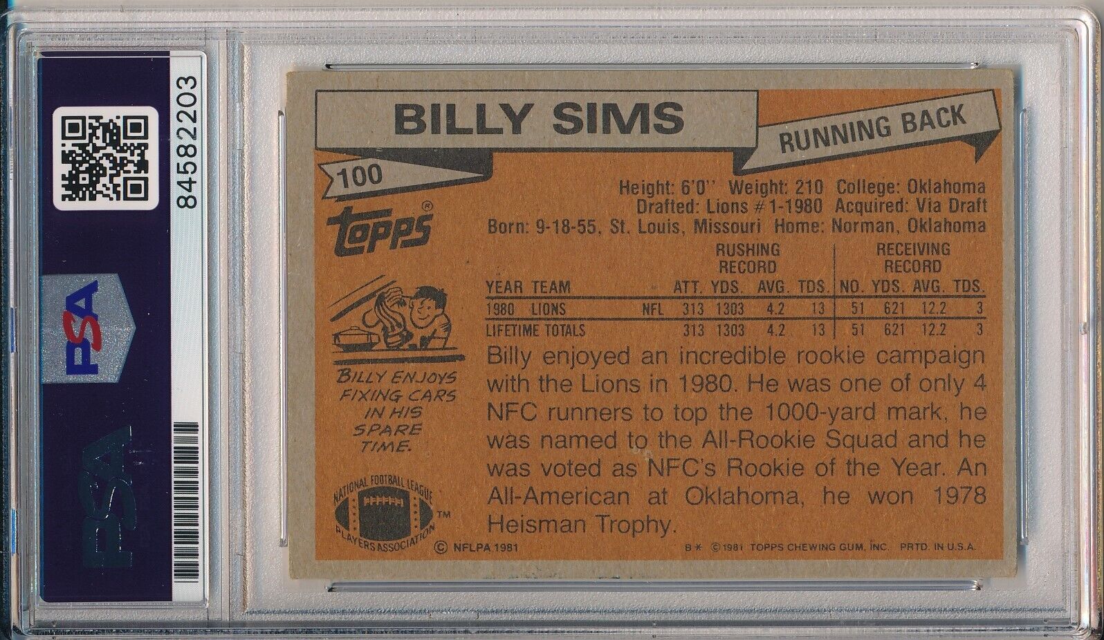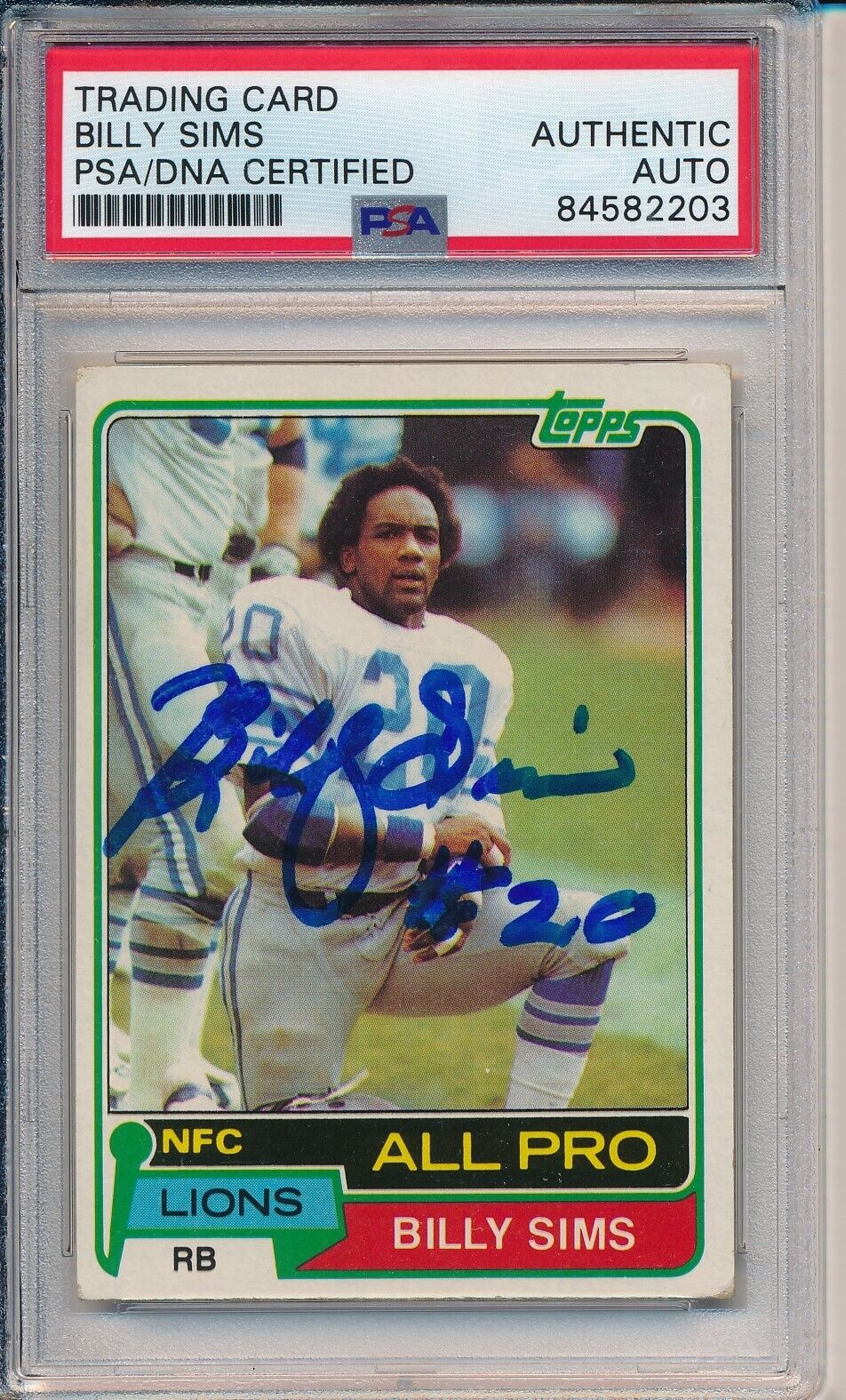 Offered is a Billy Sims Signed/Auto 1981 TOPPS Rookie Card #100 Detroit Lions. This card is authenticated by PSA/DNA and is Encapsulated in their Tamper-proof Case.