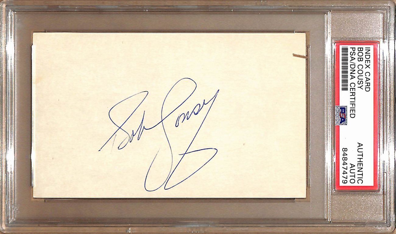 Offered is a Bob Cousy HOF Autographed 3x5 Index Card Boston Celtics. This index card is authenticated by PSA/DNA and is encapsulatd in their tamper-proof plastic case.