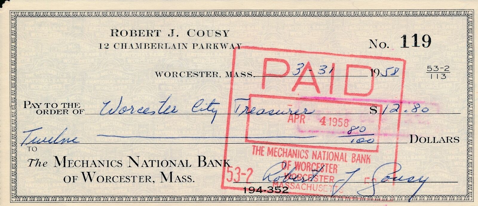 Bob Cousy HOF Boston Celtics Signed/Autographed 1958 Bank Check JSA 165562
