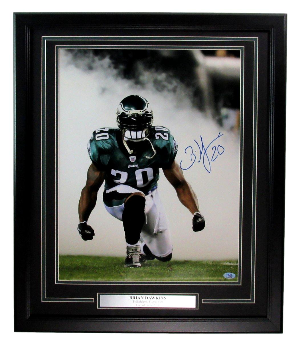 Offered is a Brian Dawkins HOF Signed 16x20 Photo Philadelphia Eagles Framed. The outer frame size is 22 inches x 26 inches. This Photo is authenticated by PSA/DNA and includes their tamper proof hologram sticker.