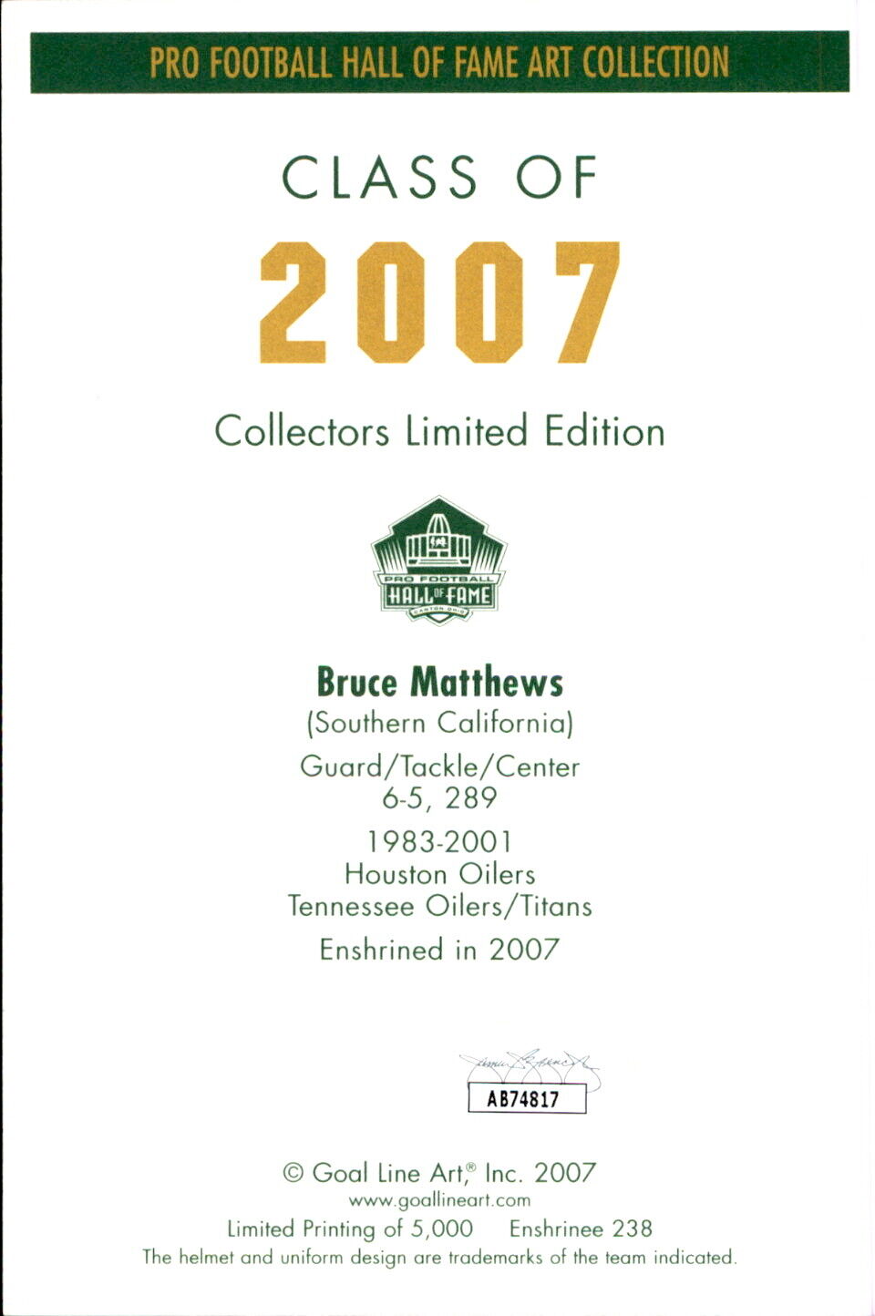 Offered is a Bruce Matthews HOF Autographed/Inscr "HOF 07" Goal Line Art GLAC Postcard Houston Oilers HOF Autographed Goal Line Art GLAC Postcard Houston Oilers. This postcard is authenticated by JSA and includes their Tamper-proof Sticker and certificate of Authenticity.