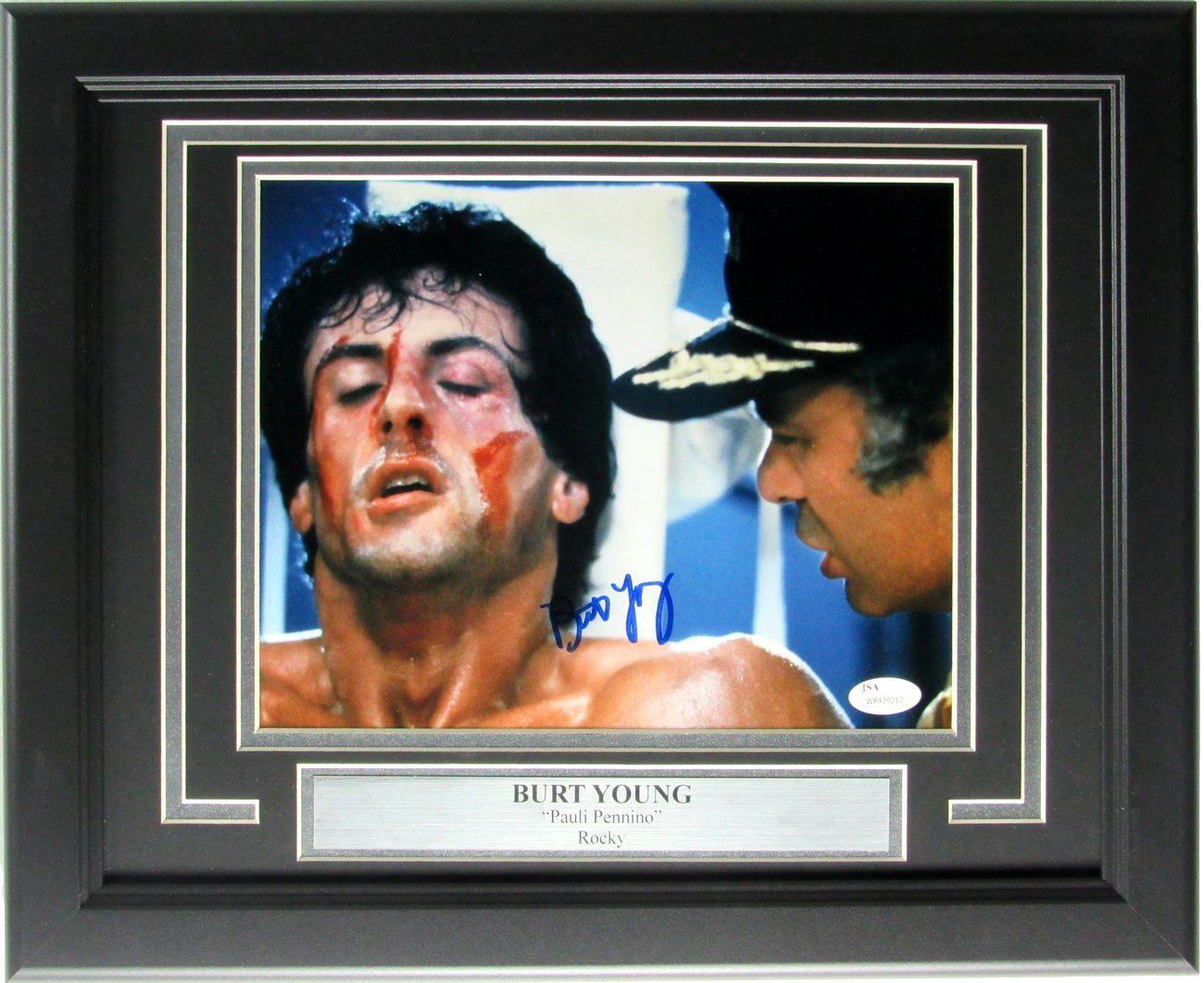 Offered is a Burt Young "Pauli Pennino" Rocky Signed/Autographed 8x10 Photo Framed. The outer frame size is 16 inches x 13 inches. This photo is authenticated by JSA and includes their Tamper-proof Hologram Sticker and Certificate of Authenticity.