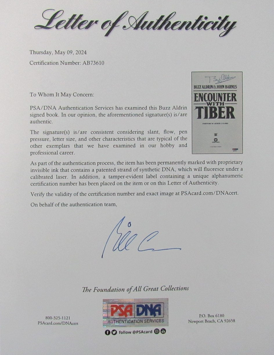 Offered is a Buzz Aldrin Signed/Autographed "Encounter with Tiber" Book. This book is authenticated by PSA/DNA and includes their Tamper-proof Sticker and Letter & Certificate of Authenticity.
