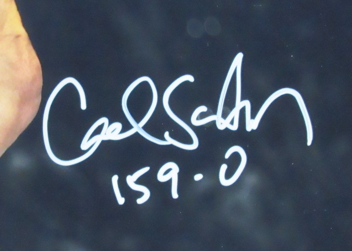 Offered is a Cael Sanderson Iowa State Wrestling Signed/Inscribed "159-0" 11x14 Photo Framed. The outside dimensions of the frame are 22 inches x 18 inches. This Photo is authenticated by JSA and includes their Tamper-proof Hologram Sticker with QR Code.