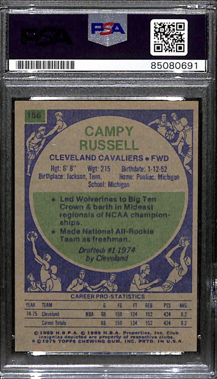Offered is a Campy Russell Autographed 1975-76 Topps Card #156 Cleveland Cavaliers. This Card is authenticated by PSA/DNA and is encapsulated in their tamper-proof plastic case.