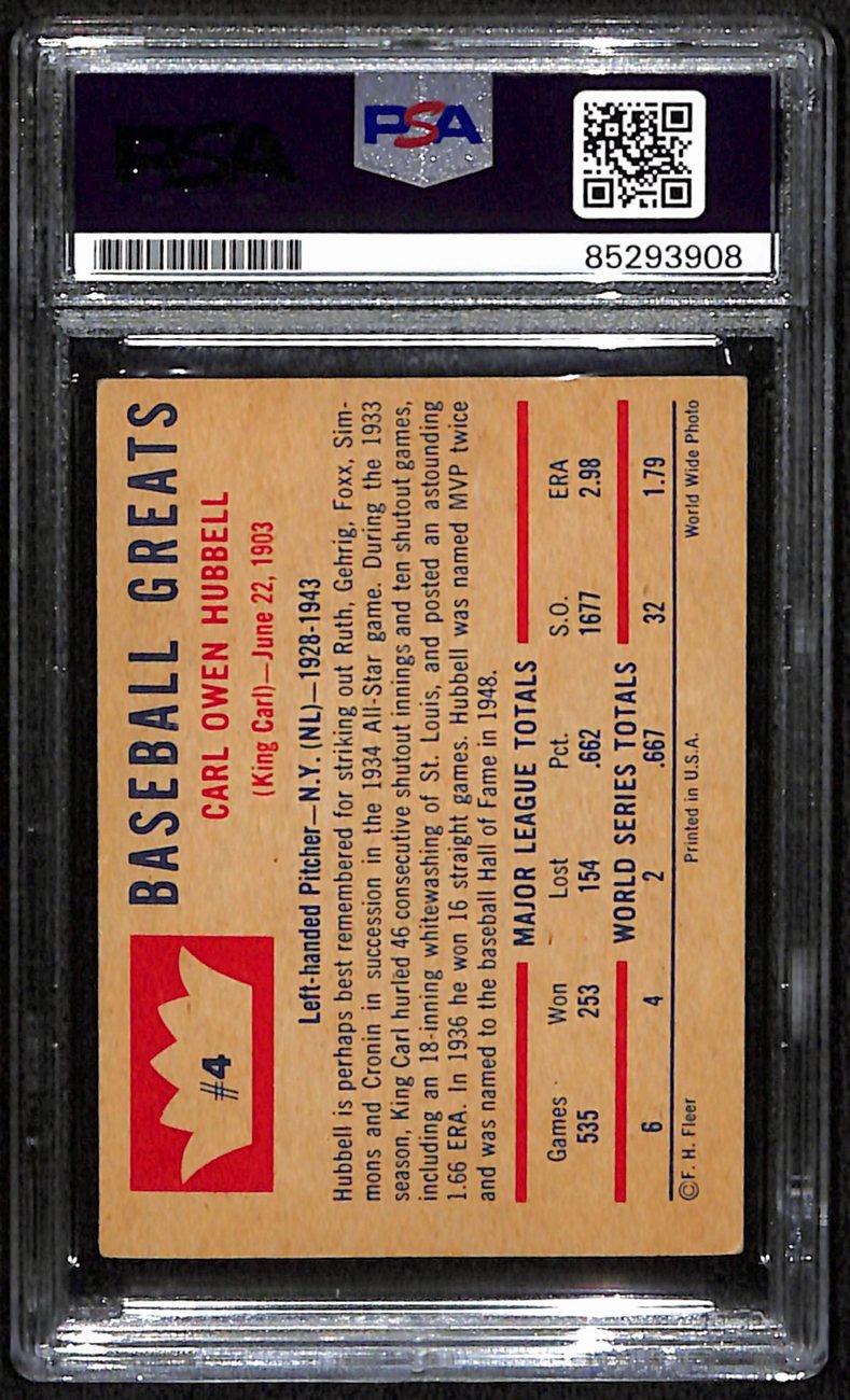 Offered is a Carl Hubbell HOF Signed/Autographed 1960 Fleer Baseball Greats Card #4 NY Giants. This card is authenticated by PSA/DNA and is encapsulated in their tamper-proof plastic case.