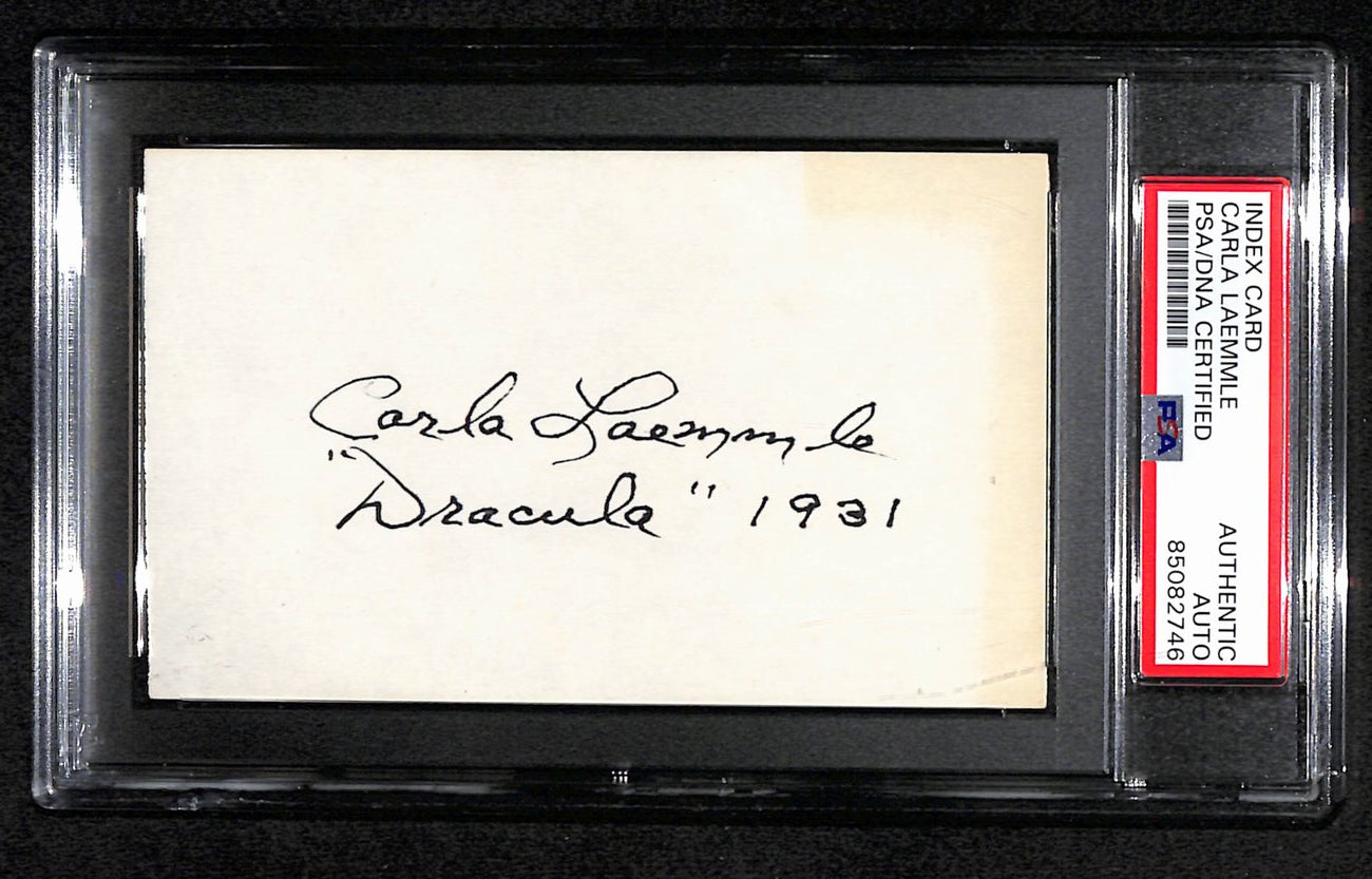 Offered is a Carla Laemmle Signed/Inscribed 3x5 Index Card "Dracula" 1931 3. This Card is authenticated by PSA/DNA and is encapsulated in their tamper-proof plastic case.