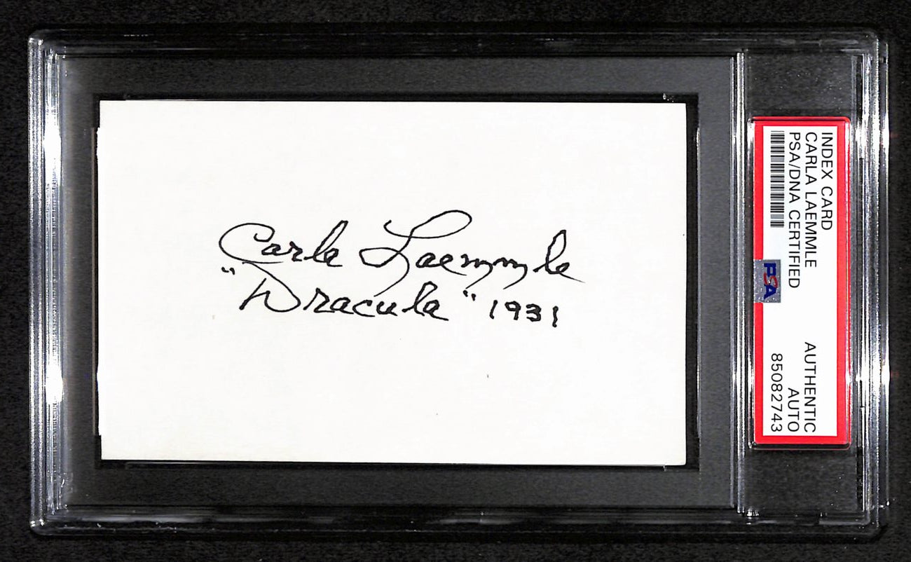Offered is a Carla Laemmle Signed/Inscribed 3x5 Index Card "Dracula" 1931 4. This Card is authenticated by PSA/DNA and is encapsulated in their tamper-proof plastic case.