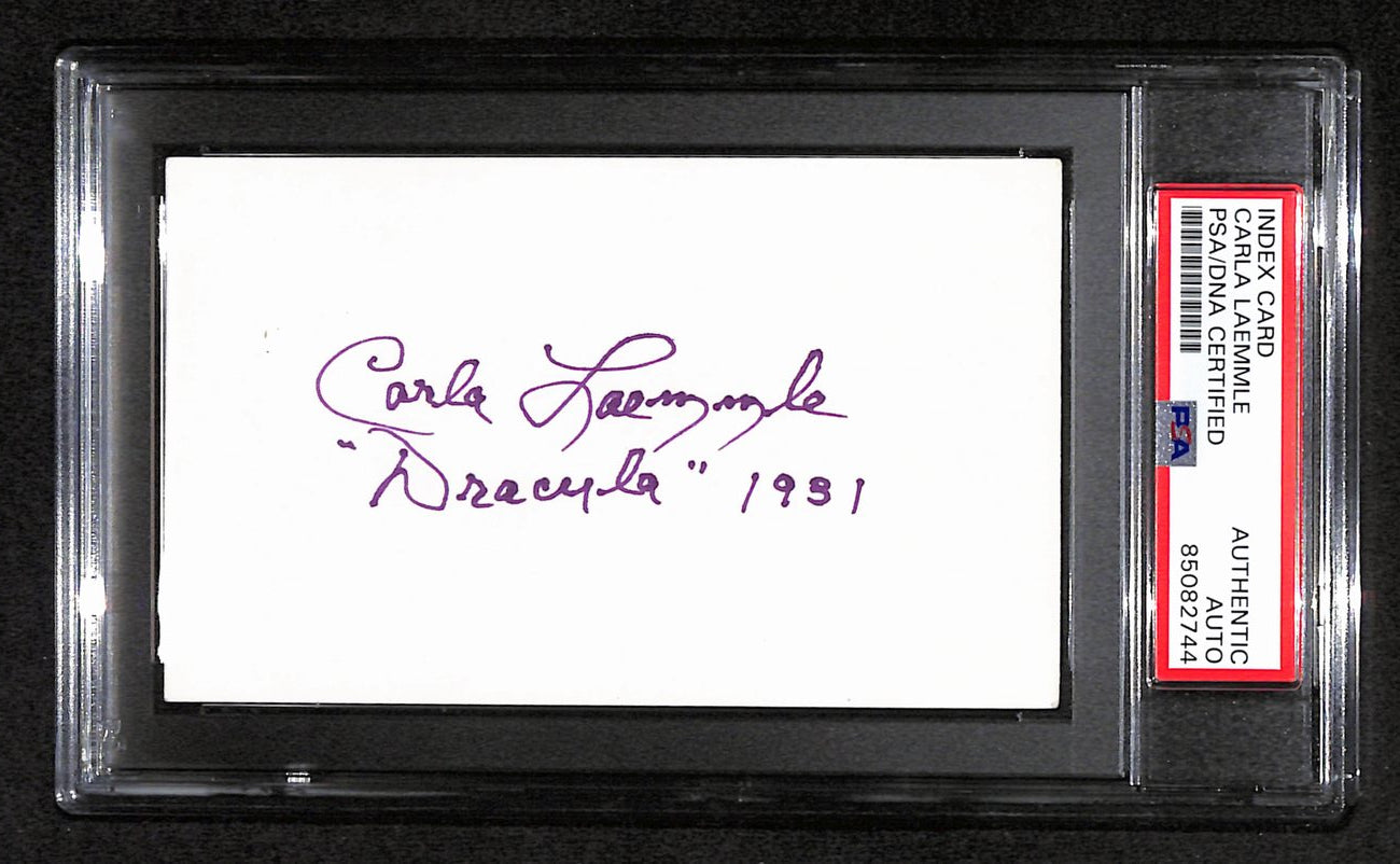 Offered is a Carla Laemmle Signed/Inscribed 3x5 Index Card "Dracula" 1931 5. This Card is authenticated by PSA/DNA and is encapsulated in their tamper-proof plastic case.