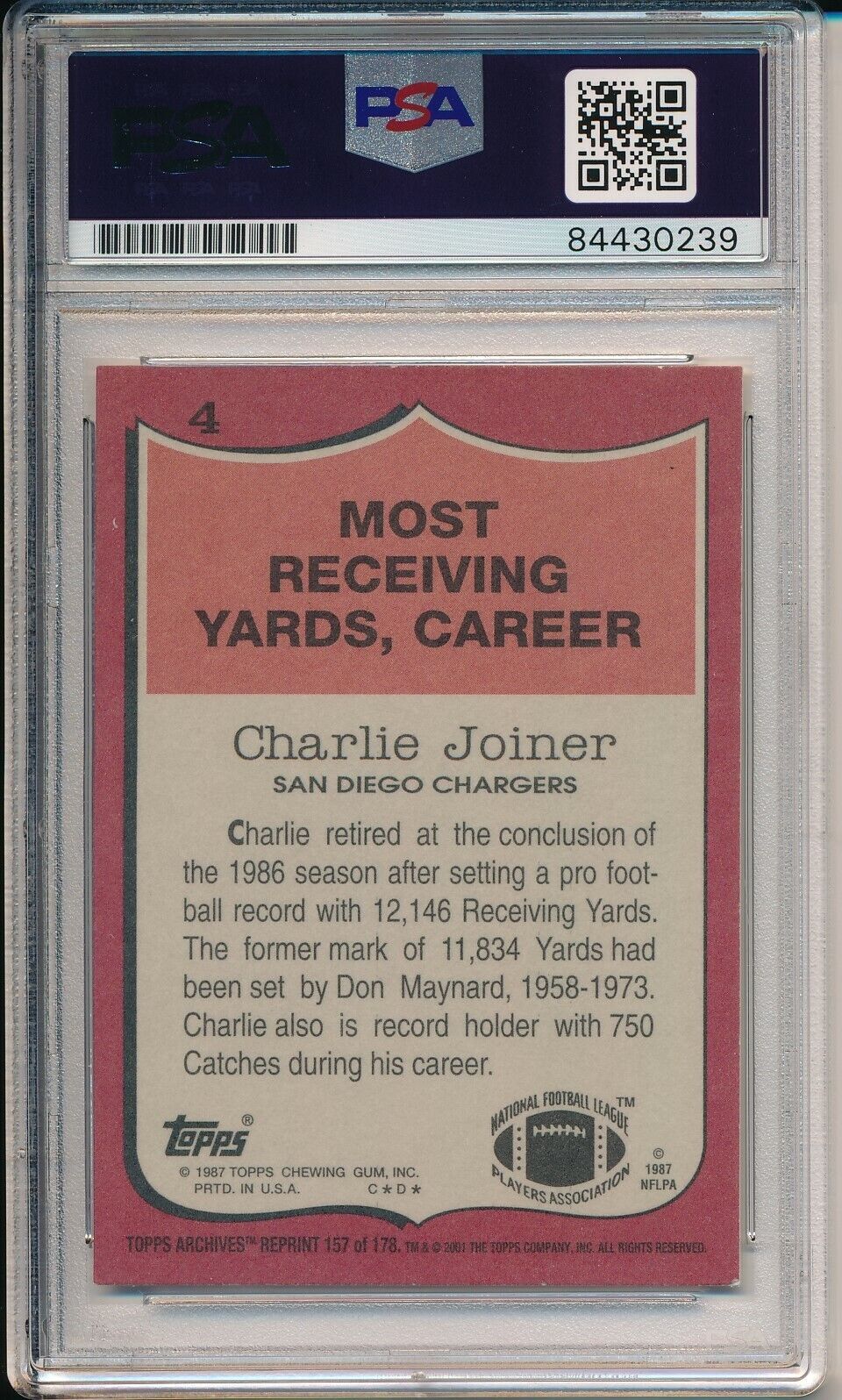 Offered is a Charlie Joiner HOF San Diego Chargers Signed/Autographed 2001 TOPPS Card #4. This card is authenticated by PSA/DNA and is encapsulated in their plastic case.