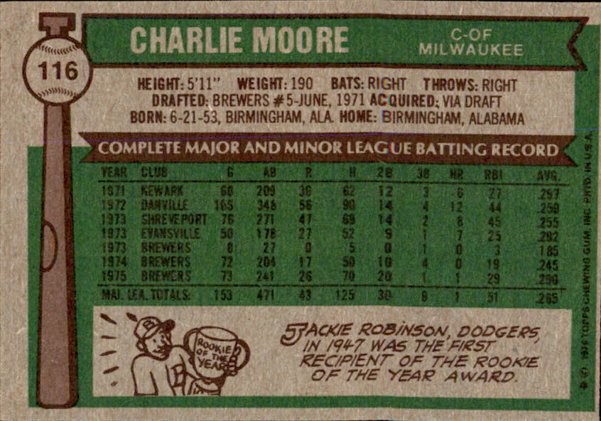 Offered is a Charlie Moore Autographed 1976 TOPPS Card #116 Milwaukee Brewers.