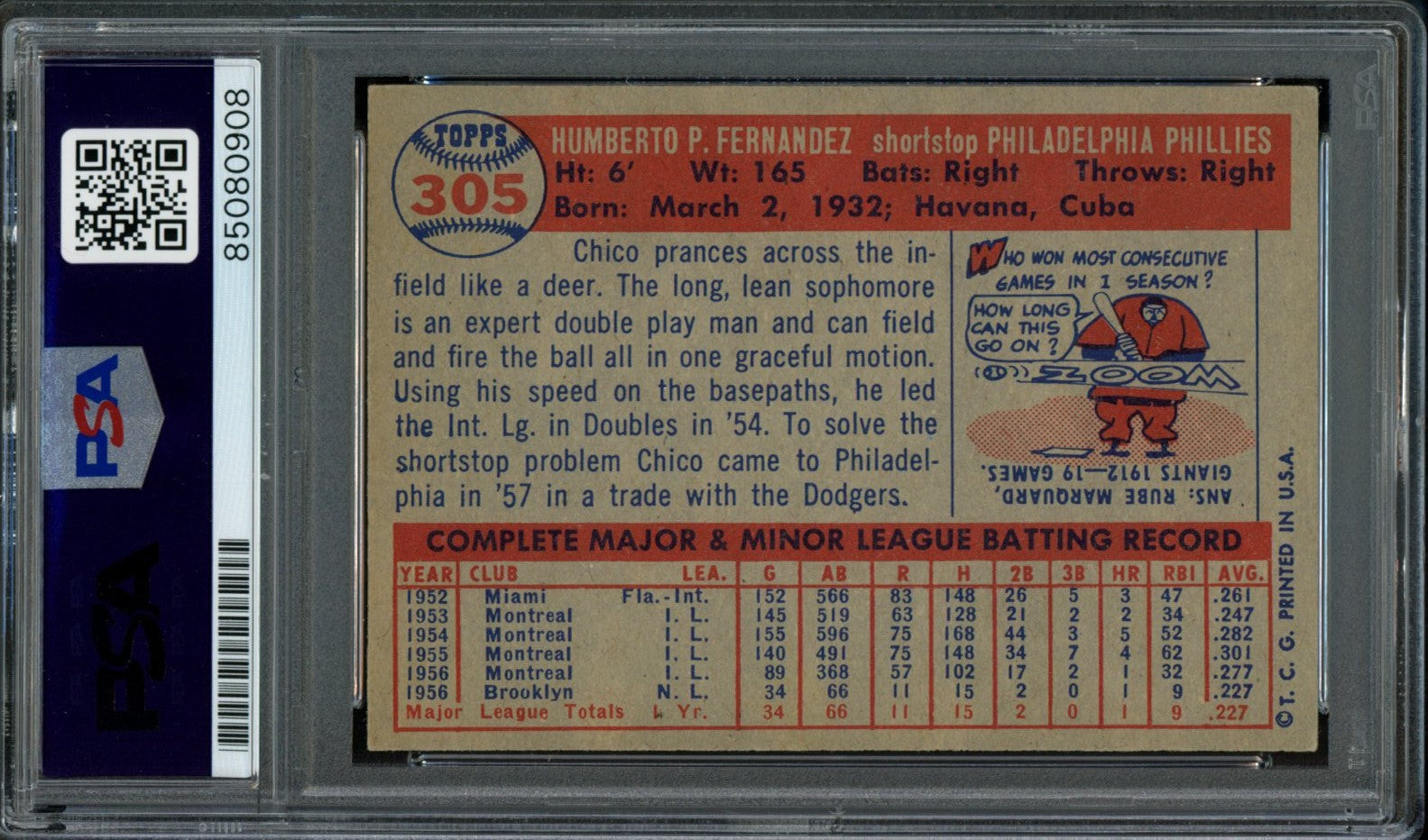 Offered is a Chico Fernandez Signed 1957 Topps Trading Card #305 Philadelphia Phillies. This Card is authenticated by PSA/DNA and is encapsulated in their tamper-proof plastic case.