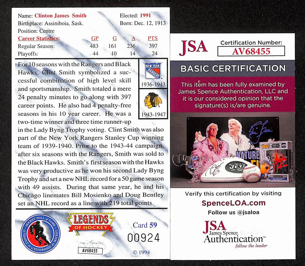 Offered is a Clint Smith HOF Signed/Autographed 1994 Legends of Hockey Card #89 Chicago Black Hawks. This card is authenticated by JSA and includer their tamper-proof sticker and Certificate of Authenticity.