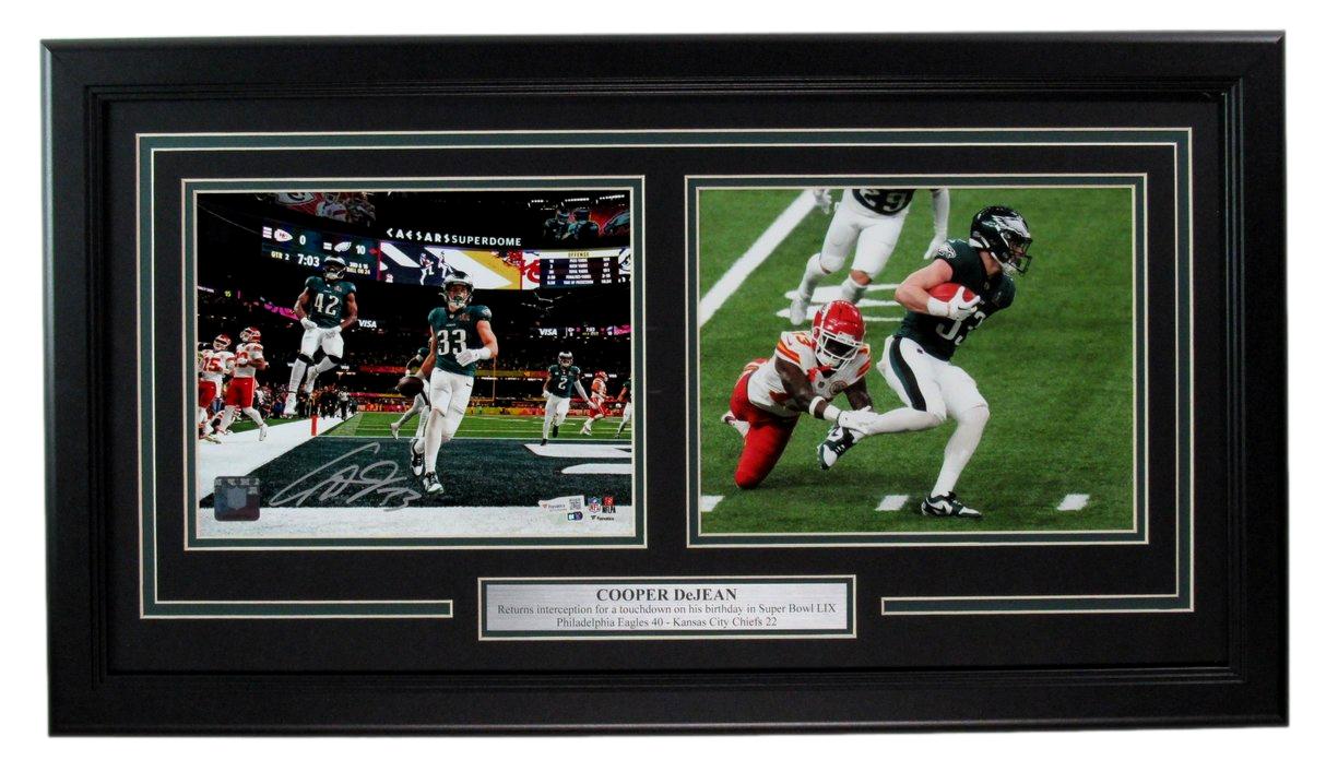 Offered is a Cooper DeJean Signed/Autographed 8x10 Photo Collage Super Bowl LIX Pick Six Philadelphia Eagles Framed. The outer frame size is 27 inches x 16 inches. This photo is authenticated by Fanatics Authentic and includes their tamper-proof hologram sticker.