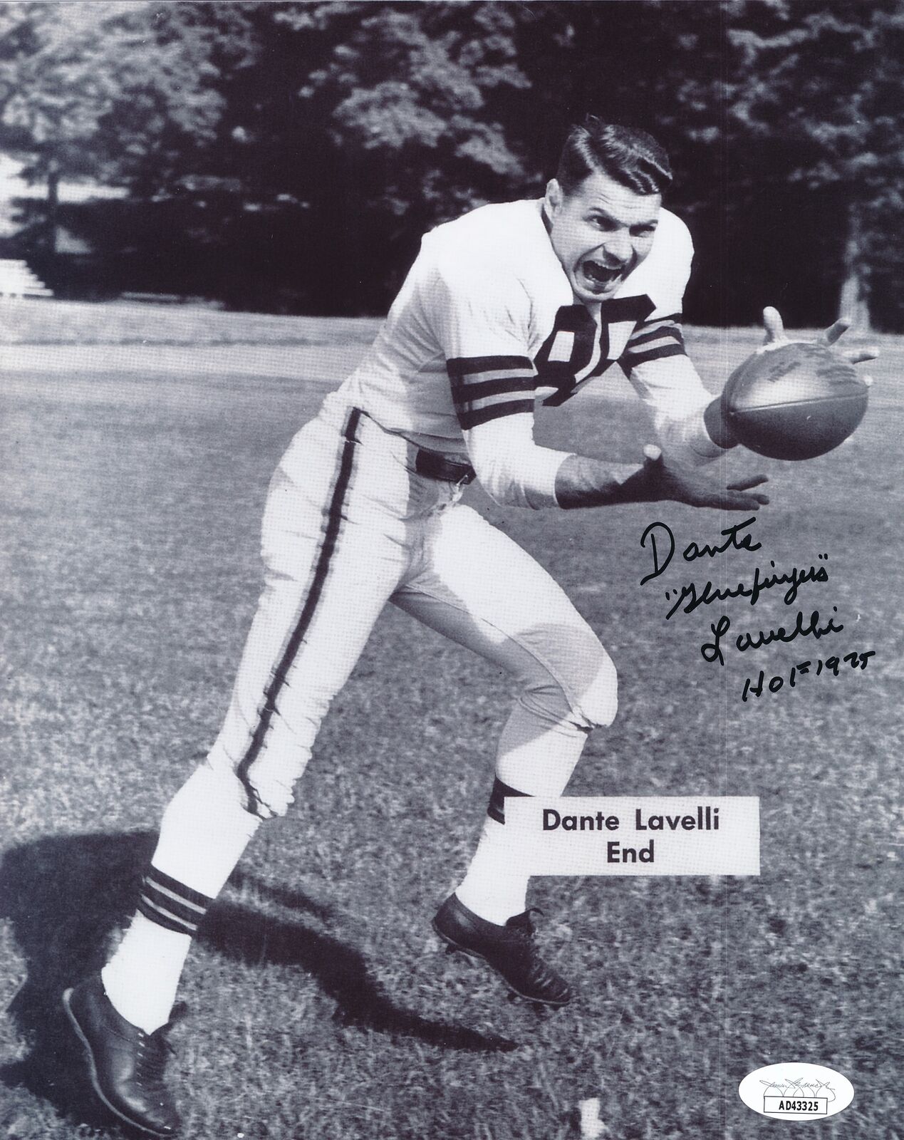 Offered is a Dante Lavelli HOF Autographed/Inscribed "Gluefingers HOF 1975" B/W 8x10 Photo Cleveland Browns. This photo is authenticated by JSA and includes their Tamper-proof Sticker and Certificate of Authenticity.