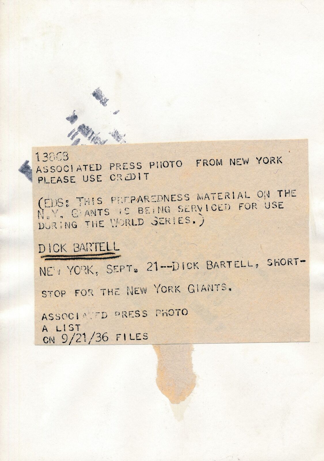Offered is a Dick Bartell 5x7 B/W 1936 Press Wire Photo New York Giants.