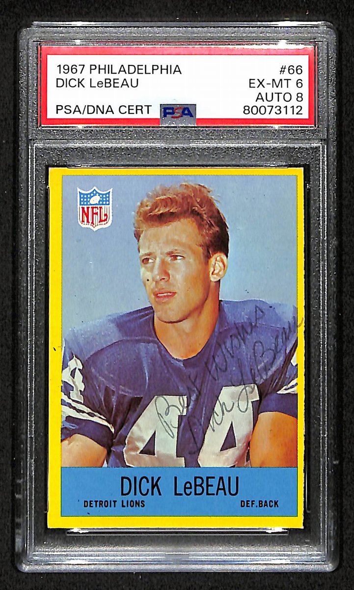 Offered is a Dick LeBeau HOF Signed 1967 Philadelphia Card #66 Detroit Lions PSA/DNA. This card is authenticated by PSA/DNA Graded EX-MT 6 and is encapsulated in their tamper-proof acrylic case.