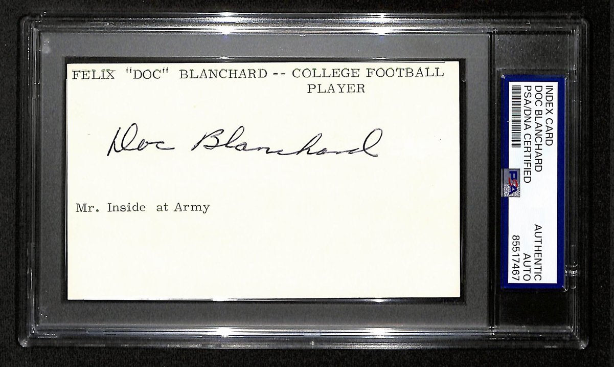 Offered is a Doc Blanchard Signed/Autographed 3x5 Index Card Army 1945 Heisman. This card is authenticated by PSA/DNA and and is encapsulated in their tamper-proof acrylic case.