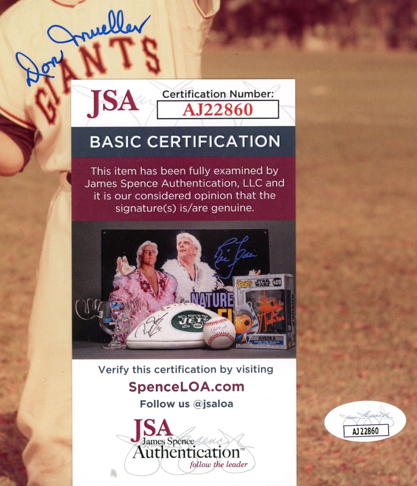Offered is a Don Mueller Autographed 8x10 Photo New York Giants. This photo is authenticated by JSA and includes their Tamper-proof Sticker and Certificate of Authenticity.