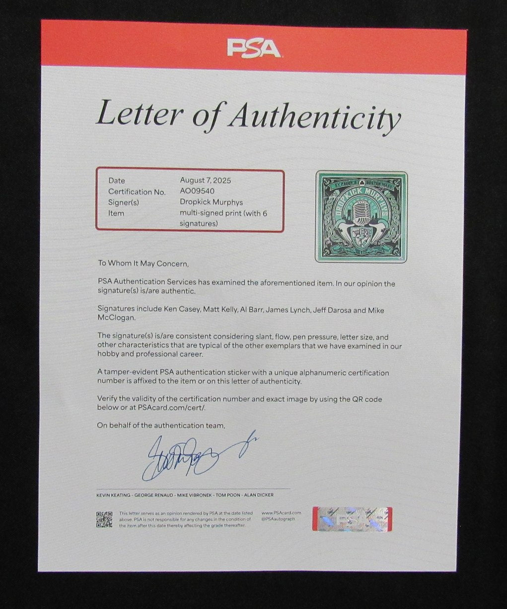 Offered is a Dropkick Murphys Multi Signed by 6 St Patricks Day Boston 2011 Show Poster. The poster is on heavy stock and is numbered 105 out of 600. Signatures include Ken Casey, Matt Kelly, Al Barr, James Lynch, Jeff Darosa, and Mike McClogan. This poster is authenticated by PSA/DNA and includes their Tamper-proof Hologram Sticker and Letter of Authenticity.