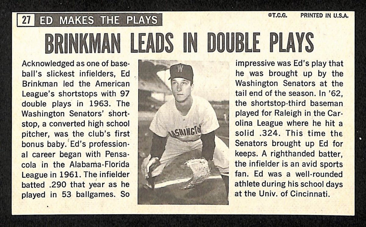 Offered is an Ed Brinkman Signed/Autographed 1964 TOPPS Giants Card #27 Washington Senators.