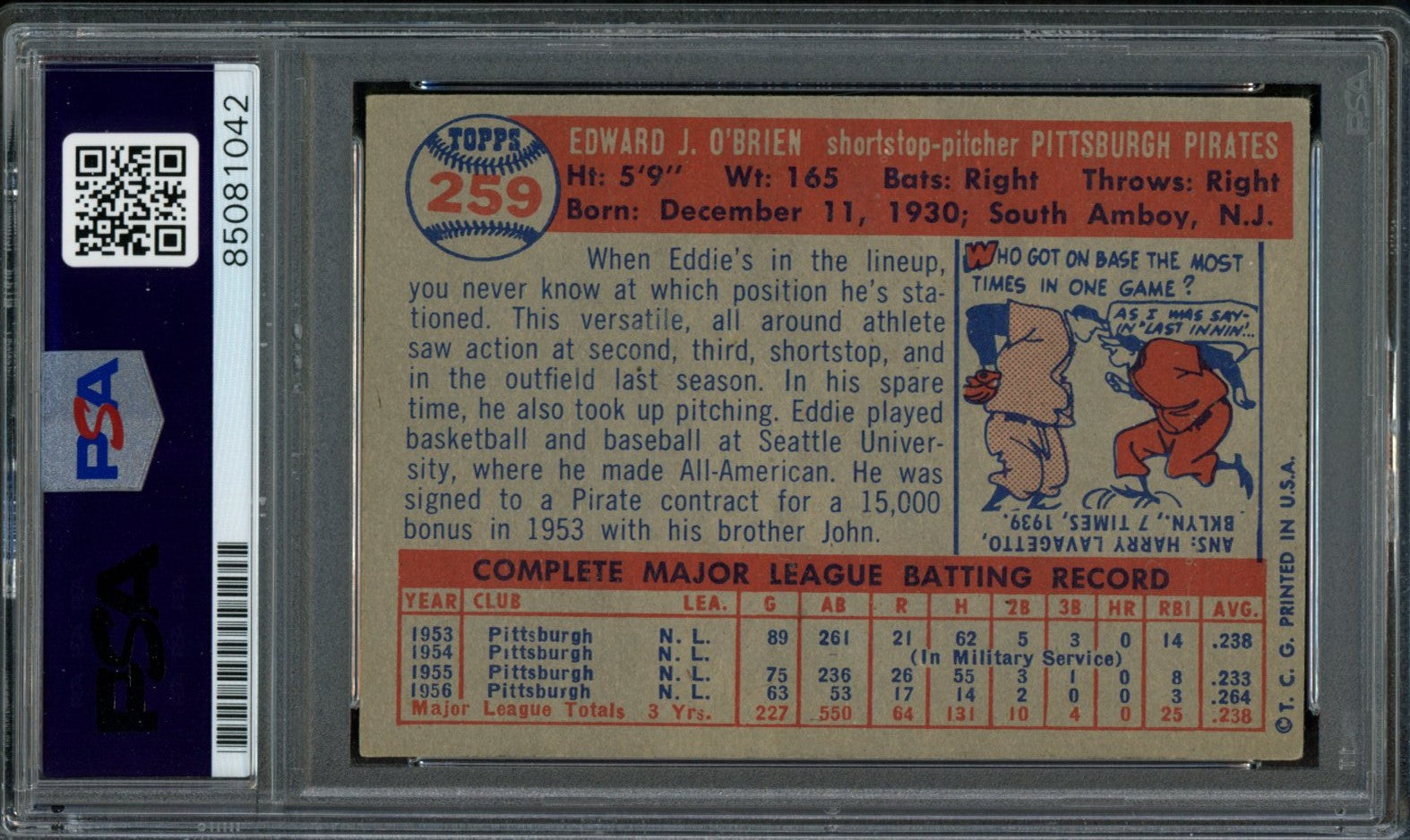 Offered is a Eddie O'Brien Signed 1957 Topps Trading Card #259 Pittsburgh Pirates. This Card is authenticated by PSA/DNA and is encapsulated in their tamper-proof plastic case.